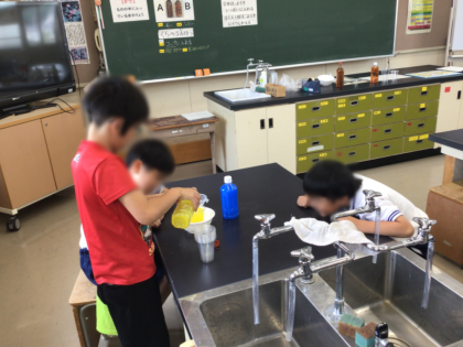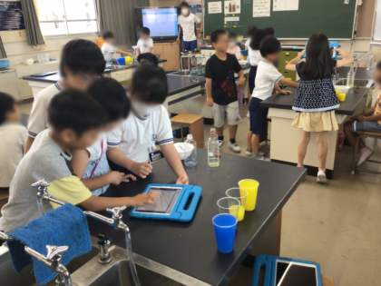 算数の「かさ」の単元で、校内の研究授業会が行われました。子どもたちはどうやったらかさを比べられるか、予想をたてて実験を行っていました。