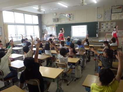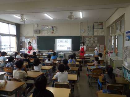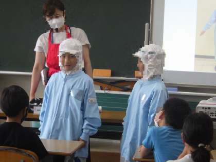 本日は、3年生がキューピーより講師をお招きし、キューピー講座をしていただきました。ビデオを視聴したり、キューピーマヨネーズについてのクイズなどを通して製造について学び、実際に作業されている方のユニフォームを試着したりしました。