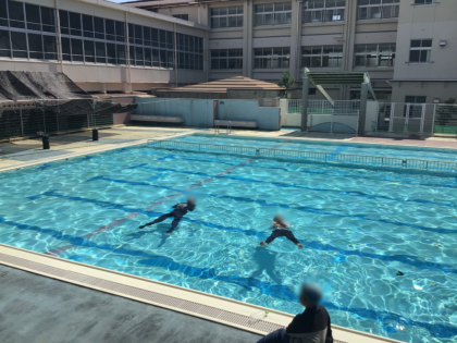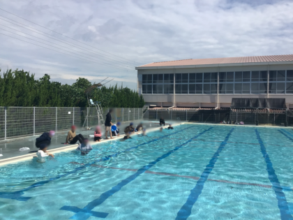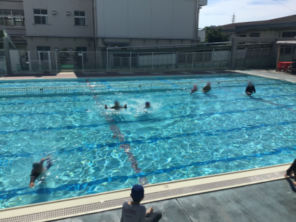 今日は、着衣水泳の様子をお知らせします。6年生が普段の洋服でプールへ入り、どれくらい泳ぎにくいか、どうしたら良いのか学びました。合言葉は「浮いて待つ」です。ペットボトルやビニール袋を使って浮く練習をしました。
