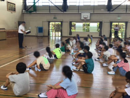 はじめに、整備・福祉委員会の皆さんが、青少年赤十字の入会式を行いました。劇を通して「優しい言葉があふれる五ケ丘小学校」にしたいとの思いが伝えられました。校長からは夏休みのお手伝いの話がありました。また、生徒指導から夏休みの生活についての話がありました。