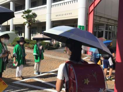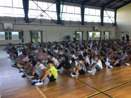 写真左は、民生児童委員さんによるあいさつ運動の様子です。写真右は、全校集会の様子です。校長からは、夏休みの学校の様子や9月から頑張ってほしいこと、「実際にやってみることで分かることがある」などの話がありました。