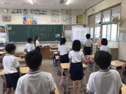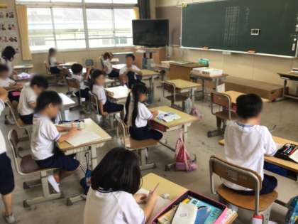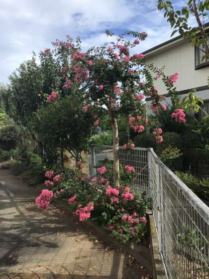 写真左は、赤門近くの百日紅(サルスベリ)がきれいに咲いている様子です。白くツルツルした幹が特徴です。学校へお越しの際は是非ご覧ください。写真中は、1年生の朝の準備の様子です。学校へ登校してからの準備が早くなりました。写真右は4年生の朝の会の様子です。朝は歌から始まっています。