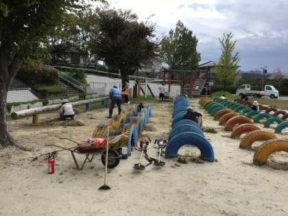 10月8日に小学校運動場の草刈りボランティアを行いました。25名のボランティアが応募をしてくださいました。天候は曇りで絶好の草刈り日和となりました。運動場の草もスッキリしました。