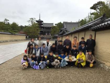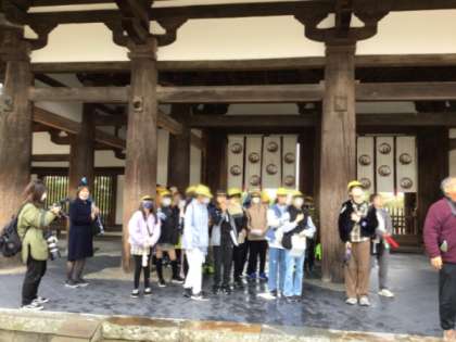 法隆寺見学です。少し雨がぱらついています。