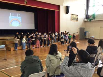 写真左は、1年生の発表です。これまでにできるようになったことを発表しました。写真右は、なかよしの発表です。ハンドベルやクイズなどを発表しました。