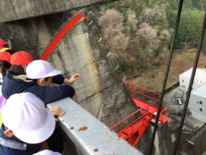 写真は三河湖で羽布ダムの説明を聞いている様子です。羽布ダムは、完成してから60年になることや、生活に必要な電気を発電していることを教えていただきました。