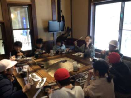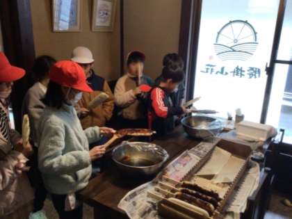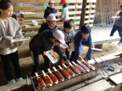腰掛山荘でお昼ご飯を食べました。五平餅を自分たちで作り、美味しくいただきました。