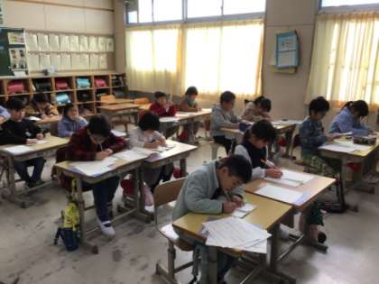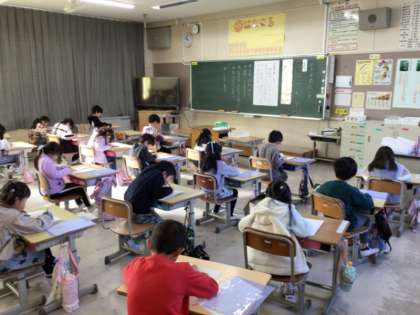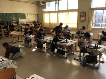書き初め大会の様子です。1年生にとっては初めての書き初め大会で、「どきどきする」と言いながら、真剣に取り組んでいました。