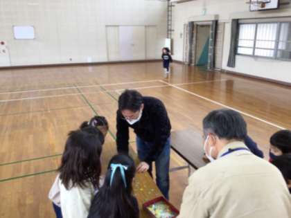 めんこ、おはじき、お手玉、けん玉遊びを教えてもらいました。子どもたちは、初めてさわる昔の遊び道具を楽しみながら遊ぶことができました。