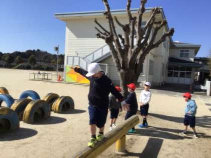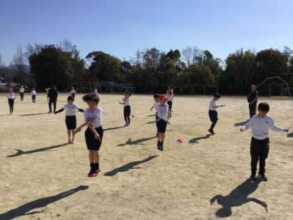 写真左はなかよし学級の体育の様子です。バランスをとりながら進んでいます。写真右は4年生の縄跳びの様子です。明日の縄跳びグランプリに向けて練習をしていました。