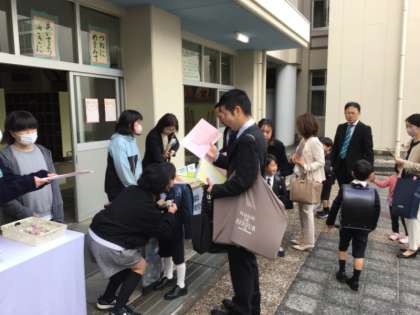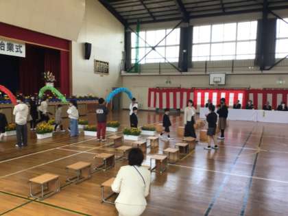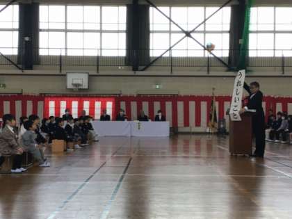 新入生に花をつけている様子です。写真中は入学式で入場している様子です。写真右は校長式辞の様子です。