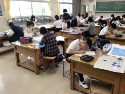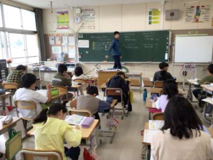 写真左は5年生の道徳の様子です。のび太の姿から学んでいました。写真右は6年生の図工の様子です。音のある景色を表現していました。