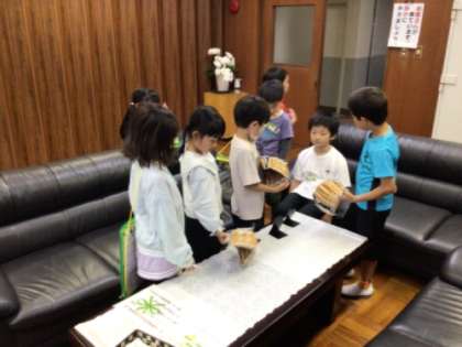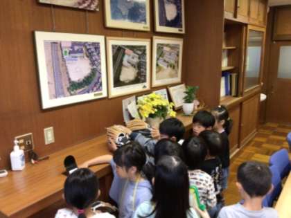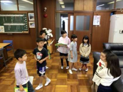 写真は校長室で大谷選手のグローブをはめるミッションをしているところです。