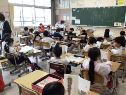 写真左は2年生の音読の様子です。写真右は、3年生の国語辞典の学習の様子です。友だちにわかりやすい声で発表したり説明したりしていました。