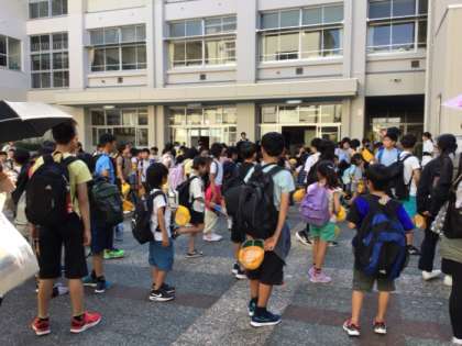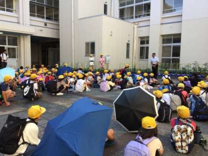 中庭で帰着式を行いました。ジブリパークを満喫したり、ファミリーの仲間と話しながらお弁当を食べたりして、楽しい思い出ができました。