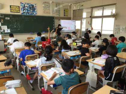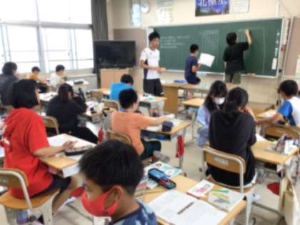 授業の様子をお伝えします。写真左は1年生の国語の様子です。伝えたい内容を作文に書く練習をしていました。写真中は4年生の算数の授業です。距離の単位を変える練習をしていました。写真右は6年生の算数です。場合分けを表を使って考えていました。
