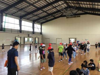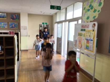 避難訓練の様子です。地震によって火災が起こった想定で防火扉を通っての避難を行いました。騒ぐことなく「おはしも」を守って避難できました。