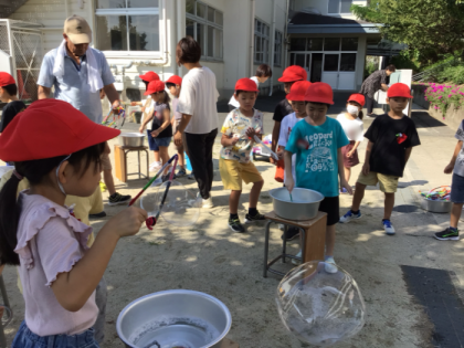 1年生がシャボン玉遊びをしました。大きなシャボン玉などたくさんのシャボン玉ができて楽しく活動することができました。地域学校共働本部の方々やボランティアのみなさん、ありがとうございました。