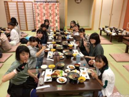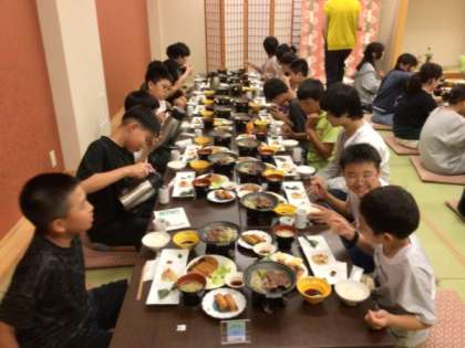 修学旅行続きです。夕食の様子です。みんな元気に食事をしています。この後お風呂に入り、翌日の準備をします。しっかり寝て明日に備えてください。本日は以上です。
