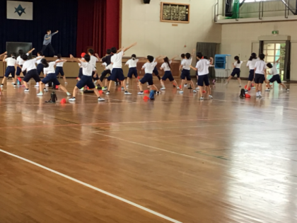 4年生は体育です。運動会に向けて練習しています。5年生は家庭科の様子です。手縫いで小物を作っています。