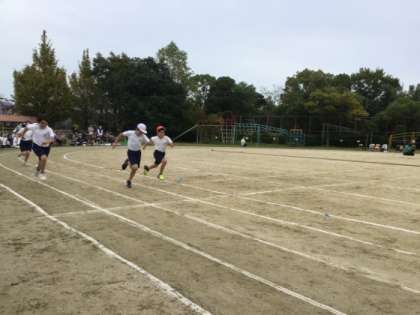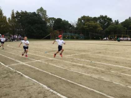 3、4年生の80m走です。コーナーをうまく走り切りました。