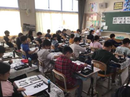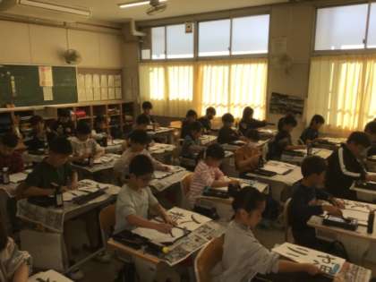 写真は4年生の書写の授業の様子です。姿勢を正して毛筆の練習をしていました。