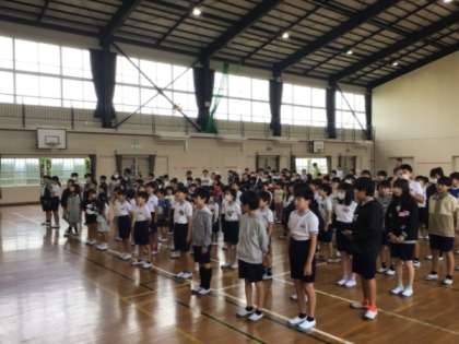 今日は全校朝会を行いました。校長からは松ぼっくりの不思議のお話がありました。その後教育実習の先生の自己紹介がありました。生活委員会から今月の生活目標の発表や今月の歌の合唱を行いました。