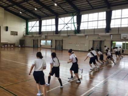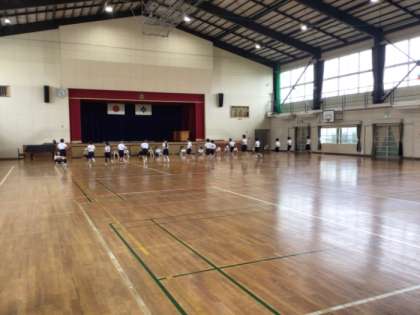 体育館でシャトルランの計測をしていました。シャトルランは一定の時間内に何回往復できるかを計測します。みんなで応援しながら自己最高記録を目指していました。