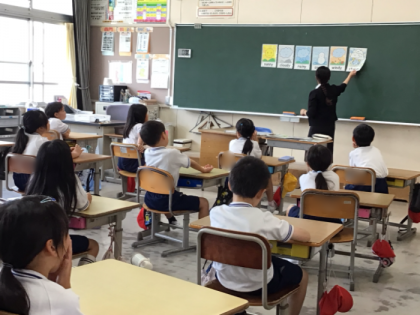 2年生は外国語の授業です。天気を聞いたり答えたりしました。みんな楽しそうに声を出していました。4年生は算数です。180度を超える角の大きさのはかり方を学習しました。