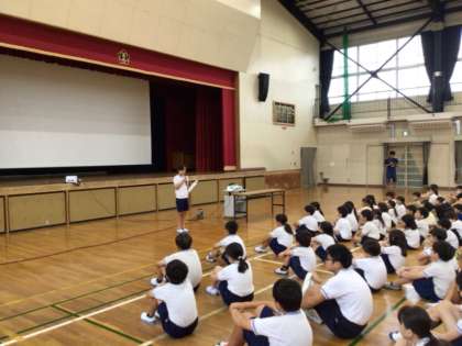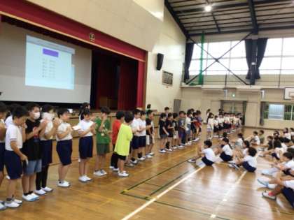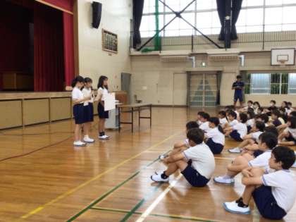 今日は全校朝会が行われました。保健委員会から背筋ピン元気はつらつ週間、整備福祉委員会からピカピカ週間の連絡がありました。また、9月1日から行われた挨拶たくさん週間の表彰が集会生活委員さんによって行われました。たくさんの挨拶名人が表彰されました。