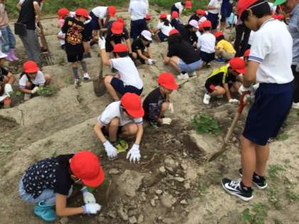 今日は、ファミリー班でさつまいもを掘り出しました。夏の酷暑の影響もあり、例年よりも収穫量は減りましたが、班で協力して掘り出しました。