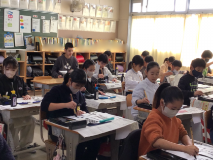 書き初め大会に向けての練習が始まっています。みんな、手本をよく見て書いていました。