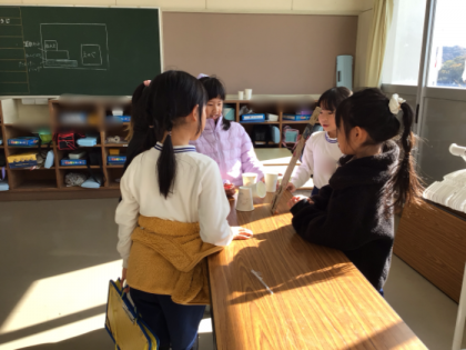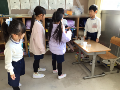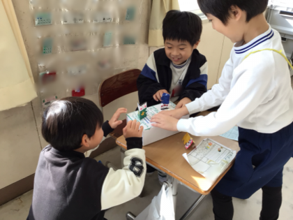 生活科「おもちゃのくに」の学習です。2年生が作ったおもちゃで、1年生が遊びました。2年生は遊び方を優しく教えていました。1年生は、とても楽しそうでした。