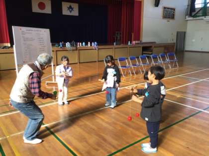 けん玉やお手玉、カルタ、コマ回し、ダルマ落としなど昔ながらの遊びに挑戦しました。「できた」という楽しそうな声が聞こえてきました。