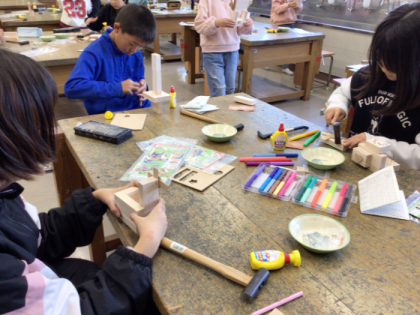 図画工作「トントンどんどんくぎうって」の学習です。木にくぎを打って、楽しい作品を...