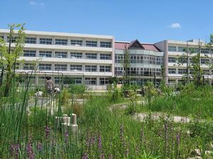 ビオトープから臨む円形ホールのある学校。
