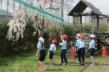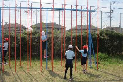 運動場の遊具を使って、体づくりの運動をしました。春らしい暖かな気候の中、楽しく運動することができました。