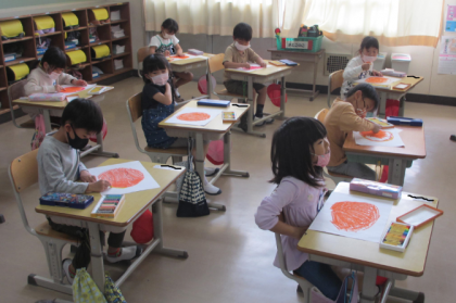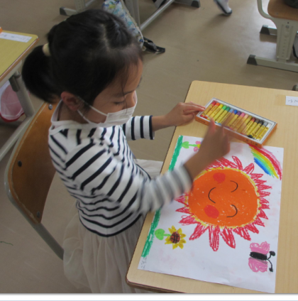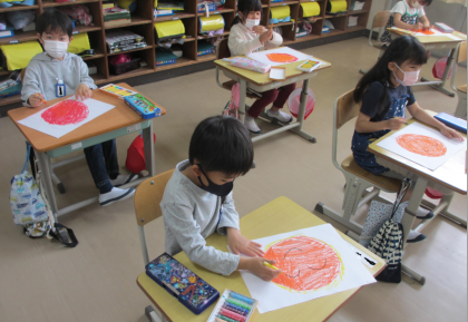 明るい色を使って、笑顔の太陽を描きました。楽しそうに描いている様子を見ていると、うきうきした子どもたちの気持ちが伝わってくるような気がします。子どもたちのうれしそうな姿に、こちらもうれしくなりました。
