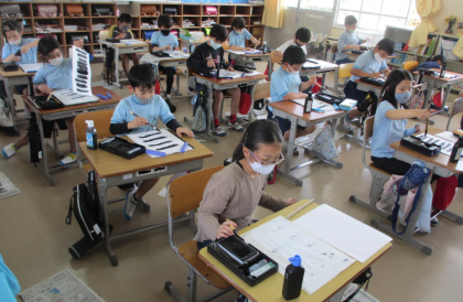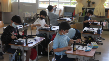 3年生から始まった習字の授業です。道具の準備や筆の使い方などにまだ慣れていない時期ですが、3年生の子たちは、落ち着いて練習ができました。この時間は、横線の練習です。漢字の「一」の文字を筆の向きや太さ、墨の量などを考えながら、何度も練習しました。