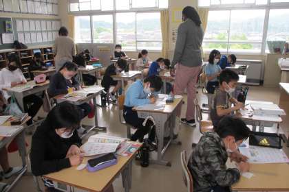 自分の名前をカードに書いて、ペアになってつづりをたずね合いました。「How do you spell your name?」「〇〇〇〇(名前のアルファベット)」の会話練習をしました。