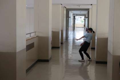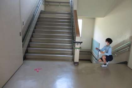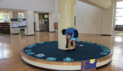 作品が完成したので、校内に展示をしました。他学年の子どもたちは、6年生が展示した作品を探し、不思議な見え方を体験しました。