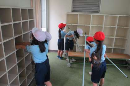 1・2年生は、プールサイドや更衣室、トイレの落ち葉やごみを拾いました。