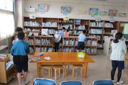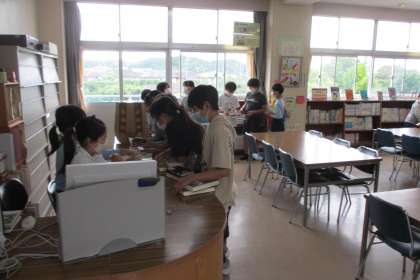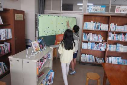 今日から「図書館おいでん週間」が始まりました。さっそく多くの子が図書室に本を借りに来ました。すでに本を読み終えた子は、「図書館の木」にシールを貼っていました。おいでん週間が終わるときには、木がシールでいっぱいになりそうです。