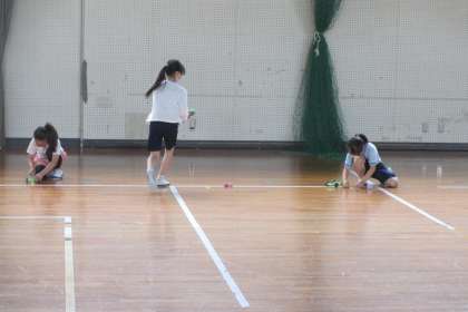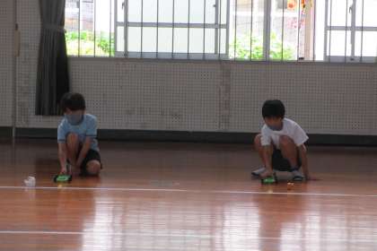 「ゴムの伸ばし方を変えると、ものの動きがどのように変わるのか」実験して確かめました。体育館でゴムの伸ばし方をいろいろ変えて、実験ゼットの車がどのくらい走るのか比べました。