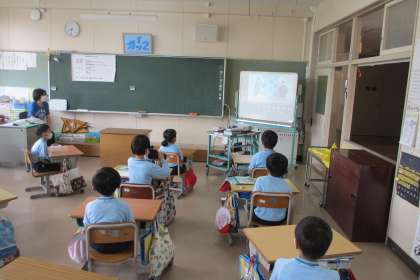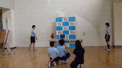 今日の集会は、企画・エコ委員会からのクイズと連絡、先生の話です。今日の集会もリモートで各学級に配信しました。クイズは、タブレットのカメラの前を左右に物を投げ、何かを当てる「何が見えるかな」クイズをしました。一瞬で画面を横切るため、なかなか何かわからなかったです。連絡では、五東小ビオトープで観察できる生き物や植物、またビオトープ設備の紹介をしました。子どもたちがいろいろなものを観察したり見つけたりして、さらに五東小ビオトープを知ってほしいです。