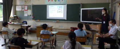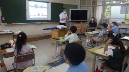 講師にお迎えして、豊田市の水道のことを教えていただきました。五ケ丘東小学校に水道の水がどのように届けられるのか、写真などの映像、地図や図などを使ってわかりやすく説明していただけました。