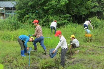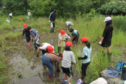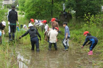 5年生は、今年もビオトープで稲を栽培します。少し遅くなりましたが、田植えの準備のため池の草取りをしました。水をしっかり抜いてないため、足元に気をつけながら行いました。