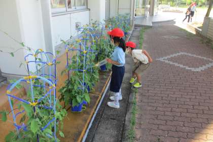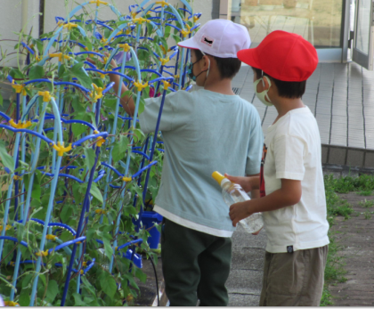 6月になり、ぐんぐんと成長しています。どの子のアサガオもたくさんのつぼみができました。そして、毎朝、アサガオの花が咲くようになりました。自分のアサガオの成長を楽しみしながら、水やりを行っています。
