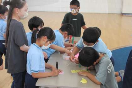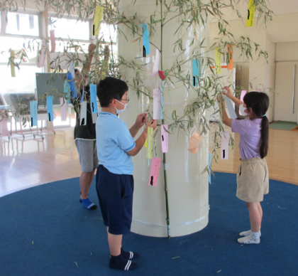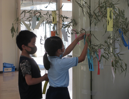 七夕飾りを一階ホールに準備しました。地域学校共働本部の方にお願いして、笹の準備をしていただきました。今日から七夕の短冊や飾りを子どもたちに付けてもらっています。さっそく多くの子が願いごとを短冊に書き、つるしました。