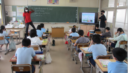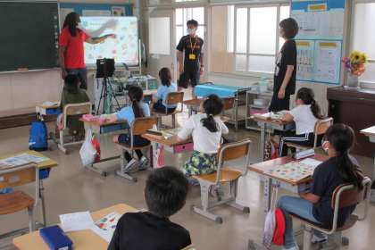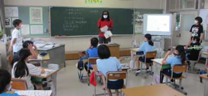 今日の外国語は、3年、5年、6年がALTの先生といっしょに行いました。3年は、いろいろなものの英語の言い方を練習した後に、「What do you like?」「I like 〜.」の練習をしました。